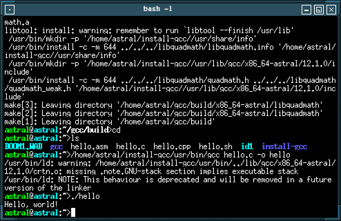 After taking some time to install due to the slow I/O, it finally built! It was able to compile a working hello world program, and marks a huge step on the way to being fully self-hosting. While I was debugging the libgcc issue, I also found out that Binutils successfuly builds too, which means the whole toolchain is able to be built inside Astral.